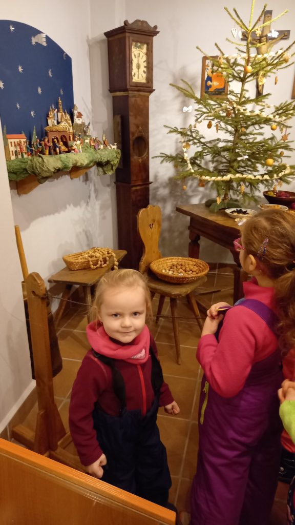 Poslední den ve školce před Štědrým dnem jsme navštívili výstavu v Krkonošském muzeu- čtyři historické domky “Zdobíme vánoční stromeček”. Naše těšení na Ježíška se ještě umocnilo.